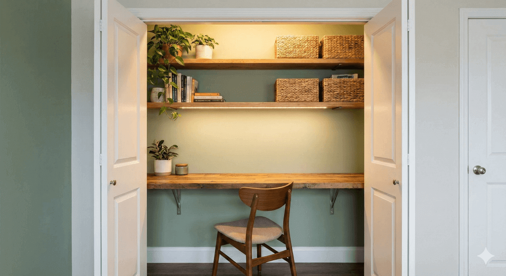 The Eco-DIY Approach: Instead of buying a new particle-board desk, source a piece of reclaimed wood or solid lumber. Cut it to the exact width of your closet.